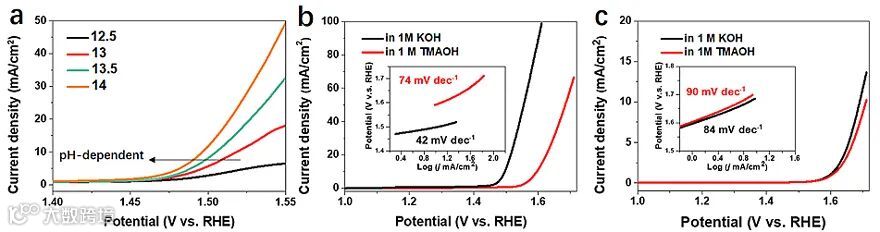 Figure 5. a) LSV curves of CoFeO@BP showing variation of OER performance with respect to pH. b) LSV curves of CoFeO@BP recorded in 1 M KOH (black) and 1 M TMAOH (red). Inset shows the Tafel plots. c) LSV curves of crystalline Co3O4 and Fe3O4 (mass ratio: 2/1) in 1 M KOH (black) and 1 M TMAOH (red). Inset shows the corresponding Tafel plots.