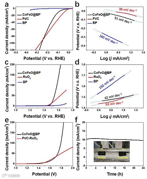 Figure 3. a) HER LSV curves of CoFeO@BP, pure BP and commercial Pt/C recorded in 1 M KOH (iR-corrected) . b) The corresponding Tafel plots. c) OER LSV curves of CoFeO@BP, pure BP and RuO2 recorded in 1 M KOH (iR-corrected). d) The corresponding Tafel plots. e) Overall water splitting performance of CoFeO@BP and commercial Pt/C-RuO2. f) Stability test of CoFeO@BP. Inset is a photograph showing bubble formation from both electrodes during electrolysis.