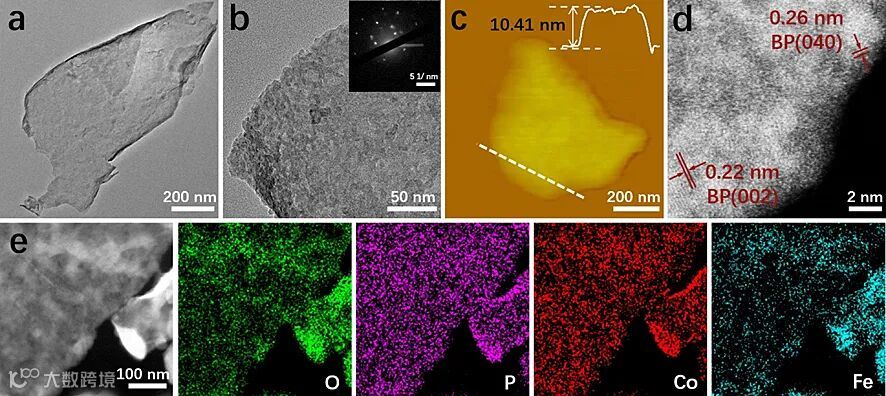 作者通过简单的溶剂热法在乙二醇溶剂中制备得到了CoFeO@BP,原料是BP纳米片和钴、铁的二价盐。在透射电镜下可发现产物保留了BP的二维纳米片结构,放大后发现其表面变得粗糙,区别与单纯的BP纳米片。原子力显微镜的表征结果表明该纳米片厚度也比初始BP 厚。然而在其表面并没有发现归属于金属氧化物的晶格,球差暗场像中可在纳米片表面观察到杂乱的亮点,很可能是无定形金属氧化物中的金属原子(Figure 1)。