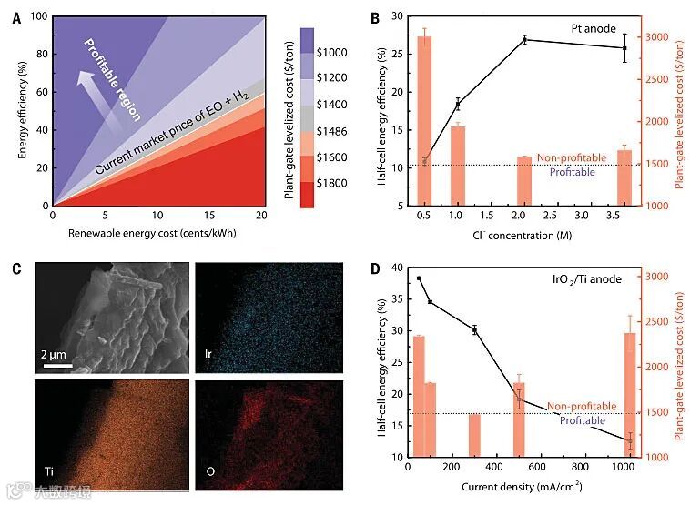 生产方法再好,如果不能带来利润就不会有工业化的前景。接下来,作者对该方法进行了技术经济分析(TEA)以确定最佳的工业生产条件。根据目前每吨环氧乙烷的市场价格以及在阴极产生的相应氢气量,作者确定在300 mA/cm2的电流密度下,要想实现盈利,最低能效约为30%。另外,作者还计算了不同的能源成本(不超过20 ¢/kWh)要想获利所需的最低能效,并显示了获利面积与能效和电力成本的关系(图4A)。为了降低能源成本,作者试图在300 mA/cm2的电流密度下,通过改变电解质浓度来提高反应的能效。如图4B所示,随着Cl-浓度增加(0.5 M→2.0 M),法拉第效率和半电池能效均有所提高,但是3.5 M的能效却有所降低,这可能是因为太高的Cl-浓度不利于Cl2歧化为HOCl和HCl(Eq. 2)。因此,作者确定最佳的Cl-浓度为2.0 M。然而,即使在最佳Cl-浓度(2.0 M)下,其平均成本仍高于目前每吨环氧乙烷和相应数量氢气的市场价格(图4B)。于是,作者尝试改变工作电极(催化剂),通过浸涂和热分解法制备了沉积在Ti网上的IrO2,能量色散X-射线光谱(EDX)证实了Ti网上存在Ir和O,这表明IrO2负载在Ti网上(图4C)。使用该催化剂,可以将所需的施加电势从3.4(±0.1)V降低到3.0(±0.1)V,从而在300 mA/cm2的电流密度下将半电池能效进一步提高到30(±1)%。