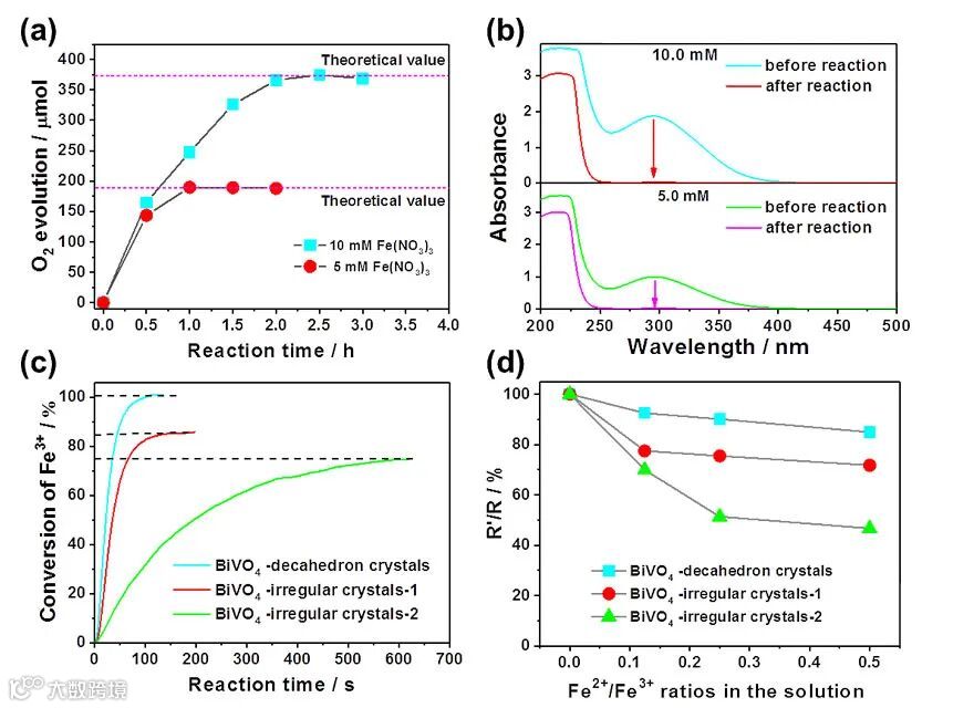 研究团队正是基于半导体不同暴露晶面之间光生电荷分离原理,通过精确调控钒酸铋水氧化光催化剂的氧化和还原反应晶面的暴露比例优化光催化水氧化反应性能,在Fe3+/Fe2+离子对作为储能介质的条件下,可见光下光催化水氧化量子效率达到60%以上,“氢农场”体系的太阳能到氢能转化利用效率超过1.8%,是目前国际上报道的基于粉末纳米颗粒光催化分解水太阳能到氢能转化效率的最高值。同时,利用光催化剂不同暴露晶面之间独特的电荷分离特性,使Fe3+/Fe2+离子对之间的逆反应得到有效抑制。并利用钒酸铋光催化剂进行了户外太阳光照射条件下的试验,验证了“氢农场”策略的可行性。该工作展示了利用基础研究成果为应用示范提供科学基础的一个鲜明示例。