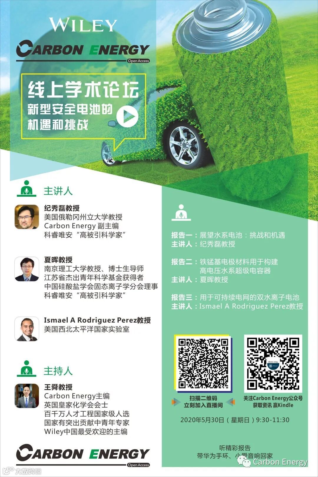 2020年5月30日上午9:30,Carbon Energy 线上学术论坛将举行新型安全电池的机遇和挑战专场,美国俄勒冈州立大学纪秀磊教授、南京理工大学夏晖教授和美国西北太平洋国家实验室Ismael Rodríguez Pérez教授和您相约直播间,欢迎大家观看。