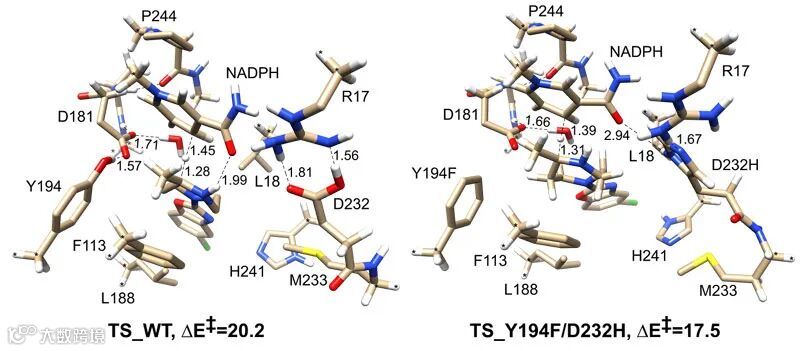 该团队前期建立了含有48种亚胺还原酶的酶库,通过对酶库的筛选发现两个酶表现出互补的立体选择性,(R)-或(S)-构型产物的对映体过量值均大于99%,催化效率分别为0.027 s-1mM-1和0.962 s-1mM-1。其后对产生苏沃雷生中间体的(R)-选择性亚胺还原酶进行单点饱和突变及迭代组合突变,获得催化效率提高61倍的双突变体。研究团队与斯德哥尔摩大学盛翔博士及所内李金龙助理研究员合作,通过密度函数计算及分子动力学计算,揭示了突变酶催化活力提高的主要原因是酶与NADPH相互作用的改变,这为提高NAD(P)H依赖型氧化还原酶的活力提供了一个新的有效改造思路。