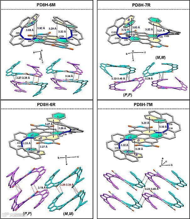 所有分子结构(包含P8H和PD8Hs)全部通过单晶X射线衍射技术得到确证。单晶结构显示P8H具有完美的[8]螺烯结构。根据两个螺烯翼相对于苝酰亚胺核位置的不同将PD8Hs的单晶结构分为两类。在PD8H-6M和PD8H-7R分子中,两个螺烯翼位于苝酰亚胺平面的同一侧,因空间位阻存在强烈的排斥作用,导致其中一个螺烯翼严重偏离苝酰亚胺核,而另一个螺烯翼几乎保持了和P8H同样紧凑的螺旋结构。而在PD8H-6R和PD8H-7M分子中,两个螺烯翼分别位于苝酰亚胺平面的上下两侧,形成了完美的双螺旋结构。从是否具有手性区分,具有相反构型螺烯翼的PD8H-6M和PD8H-7M是内消旋体,分子表现出非手性;而具有相同构型螺烯翼的PD8H-6R和PD8H-7R是外消旋体,分子表现出手性。除此之外,这类PD8Hs构型的微小差异导致了其分子排列方式的巨大差异(图3)。