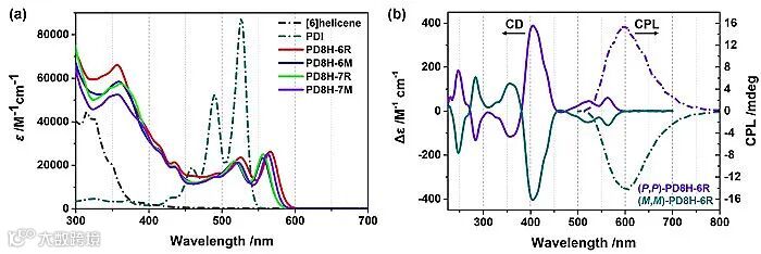 值得注意的是,外消旋型的手性分子PD8H-6R和PD8H-7R可进一步通过手性拆分分离出一对稳定的手性对映异构体,其对映体在二苯基甲醚中加热6 h后,依然保持其绝对构型。此外,由于苝酰亚胺发色团的嵌入,PD8Hs的绝对荧光量子产率可达30%,明显高于绝大多数碳螺烯衍生物。手性光学性质研究表明,PD8H-6R的吸收不对称因子(|gabs|)及发光不对称因子(|glum|)分别可达1.2 × 10-2和 2 × 10-3,该数值优于大多数碳螺烯,表明其超螺旋结构在手性传递中表现出更好的协同作用(图4)。