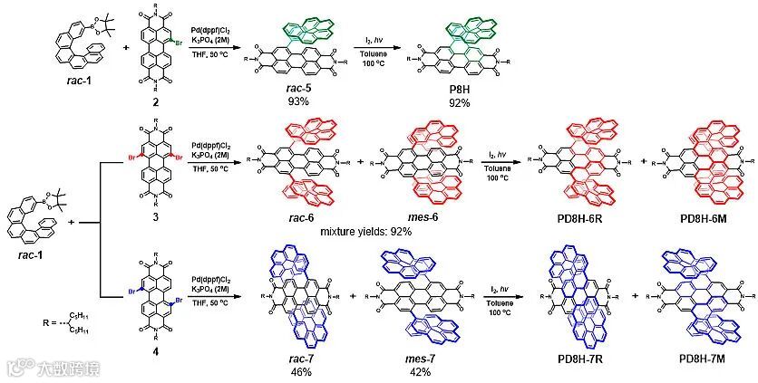 PD8Hs的合成涉及Suzuki偶联反应以及光化学环化反应两个关键步骤。为了验证此两个反应步骤的反应效率及环化反应的区域选择性,作者首先合成了模型化合物单[8]螺烯(P8H)。进一步地,分别选取1,6-二溴苝酰亚胺(化合物3)和1,7-二溴苝酰亚胺(化合物4)作为起始原料,与外消旋体(化合物1)进行偶联、环化后,分离得到了双[8]螺烯分子的六种立体异构体(图2)。该合成策略高效、区域选择性高、所有产物均具有良好的溶解性能和优异的热稳定性。