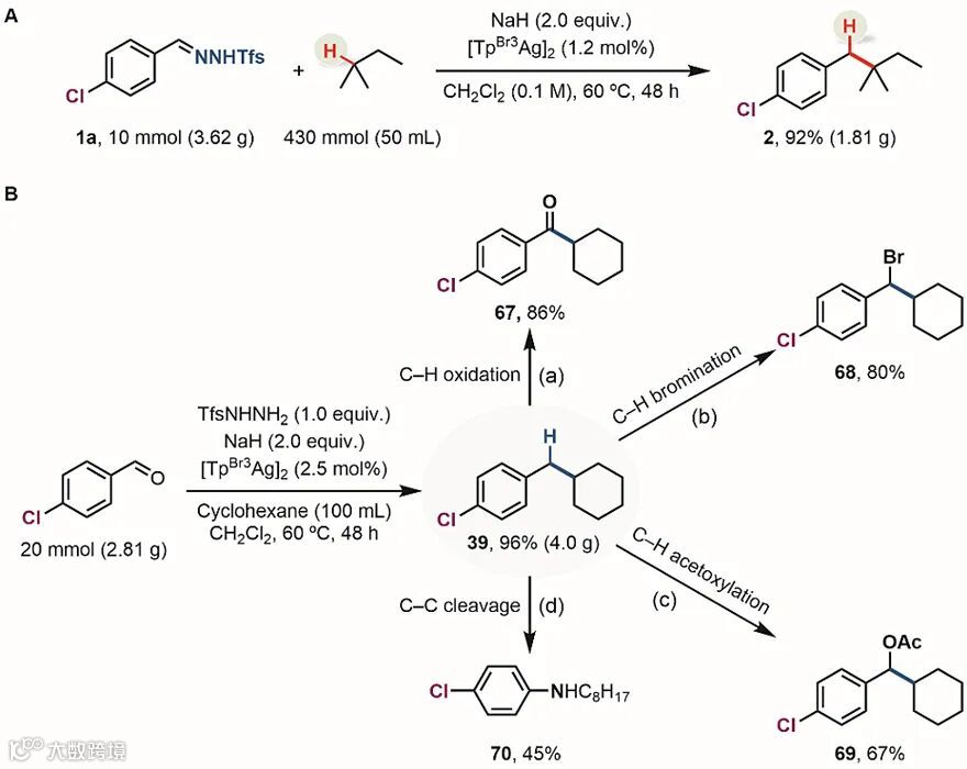 这一反应可以在克级规模进行,证明了该反应的实用性和进一步工业化应用的潜力。将烷烃和催化剂减半的情况下,10 mmol磺酰腙1a和2-甲基丁烷以高达92%产率生成1.81克C(sp3)−H键插入产物2;在标准条件下,20 mmol 4-氯苯甲醛经由一锅两步反应生成4.0克产物39,产率高达96%。作者还以产物39为例,将其进行选择性氧化、溴化、酯化等多种衍生化,展现了该反应的实用价值(图4)。