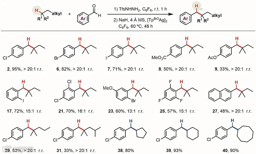 作者建立了从芳香醛出发的“一锅-两步”合成工艺:先添加4Å分子筛促进芳香醛和磺酰肼脱水生成相应的磺酰腙,然后依次加入烷烃、碱和银催化剂,以较高的收率和区域选择性一步实现芳香醛向烷基芳烃的转化(图3)。从合成转化角度看,该反应以烷烃作为烷基化试剂,实现了羰基化合物的直接还原性烷基化,这在传统合成路线中通常需要多步反应才能完成。