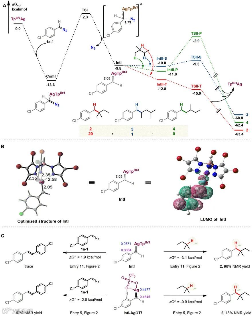 作者结合实验和理论计算研究揭示反应的机制和选择性产生的原因。他们首先通过动力学同位素效应(KIE)证实了银催化和铑催化C(sp3)−H键插入反应一样,具有一级同位素效应。随后,作者在M06-2X理论水平上进行了密度泛函理论(DFT)计算:银促进重氮化合物1a-1释放氮气生成银卡宾中间体IntI是整个反应的决速步骤(图5A)。IntI的优化结构显示,Ag−C距离为2.05 Å,呈单键特征,表明银卡宾与Fisher卡宾类似具有高亲电性;同时,银原子周围的空间环境高度拥挤(图5B),不仅可以有效的抑制卡宾的二聚,还能避免卡宾与产物苄基C−H键(反应活性高但位阻大)反应,是整个反应顺利进行的关键(图5C)。