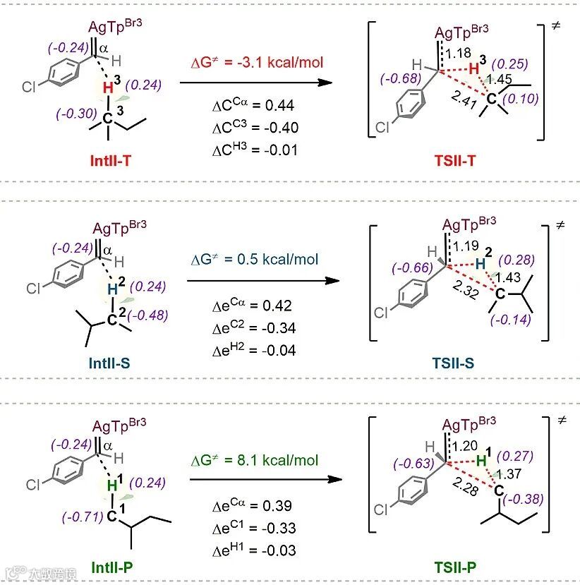 在银卡宾对C(sp3)−H键插入过程中,电荷从烷烃碳经过氢原子向卡宾碳转移,决定了反应对3°、2°和1° C−H键的位点选择性。在这一过程中,桥H原子可以看作是电荷流动的导体,其中2-甲基丁烷的3°C–H键的电荷流动最好,C–H键断裂程度最大,银卡宾对3° C(sp3)−H键插入过程无能垒,因此反应最容易进行(图6)。