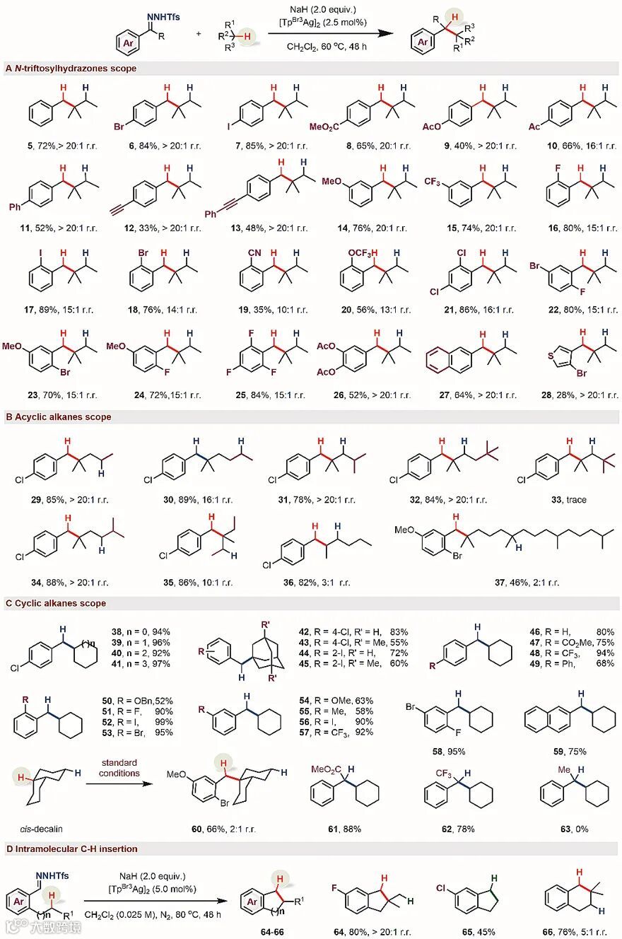 图1. 金属卡宾诱导的烷烃C−H键选择性官能化。图片来源:Chem