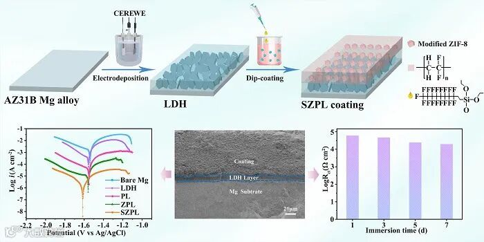 近日,西北师范大学李健教授课题组通过将LDH结构电沉积在镁片上构建了底层的转化层,随后引入ZIF-8颗粒制备了超疏水涂层浸涂在电沉积形成的LDH多孔结构上,成功构建了超疏水双层防腐涂层(水接触角>155°、滚动角<3°)。该双层涂层底部的LDH过渡结构不仅对镁合金起到保护屏蔽的作用,而且增强了镁基底与顶层超疏水ZIF-8涂层之间的结合力;同时顶部的超疏水ZIF-8层可以作为LDH层上的盔甲,弥补了LDH转化层的多孔缺陷,进一步防止腐蚀离子通过多孔缺陷渗透到镁基底表面。所制备的超疏水双层涂层浸泡在3.5 wt %的NaCl溶液中表现出优异的防腐蚀性能,其腐蚀保护效率高达99.9 %,即使在浸泡七天后仍然具有较好的防腐蚀性能。更重要的是,该表面在经过多次砂纸磨擦循环后仍表现出出色的耐磨性。同时,该双层涂层的超疏水、超低表面能特性赋予涂层优异的自清洁性能,能够有效的抗拒污染物。该研究成果中超疏水ZIF-8基双层防腐蚀涂层的构建极大地拓展了ZIF-8的应用范围,同时也为防腐涂层领域其他低表面能涂层的开发提供了一种新思路。
