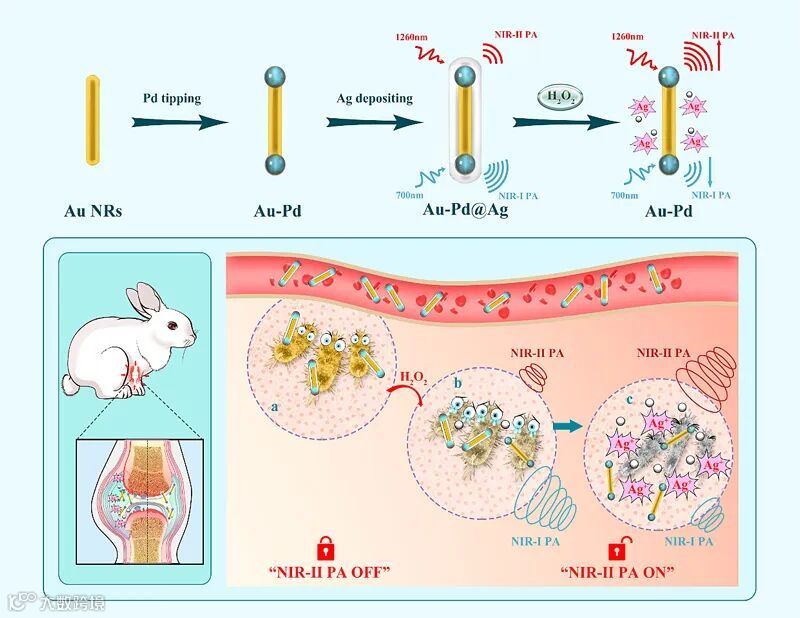 福州大学宋继彬教授课题组制备了银包覆金钯纳米棒(Au-Pd@Ag)探针,该纳米探针在炎症部位能通过比率型光声成像定量检测过氧化氢(H2O2)含量同时释放出具有杀菌作用的Ag+从而对细菌感染引起的炎症反应起到一定的抑制作用。在炎症部位中,Au-Pd@Ag纳米探针的银层会被H2O2刻蚀反应从而导致该纳米探针NIR-Ⅰ窗口光声信号值(纳米银层的光声信号)降低,而后金钯纳米棒裸露出来使得其NIR-Ⅱ窗口的光声信号值(金钯核的光声信号)不断升高,体外实验表明Au-Pd@Ag纳米探针能被H2O2特异性响应从而保证了探针在活体炎症部位能精准定量检测H2O2含量。