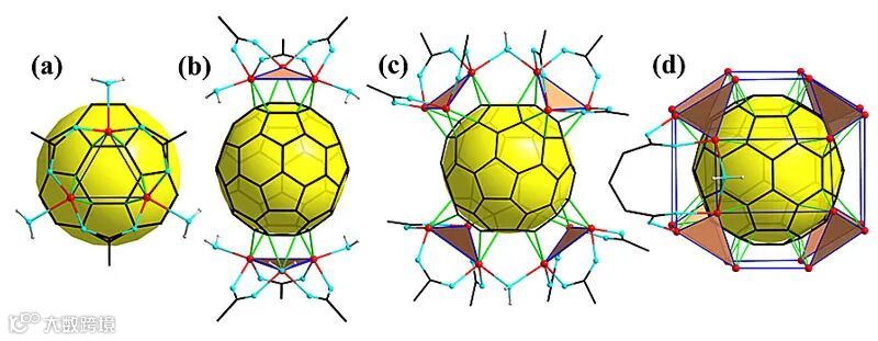 图2. (a) Cu3-[(μ3-η2:η2:η2)-C60]配位单元。(b-d) 6核,12核和24核配合物结构简图。