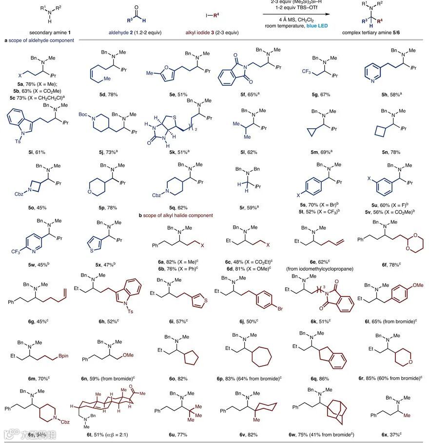 该反应中,醛和烷基卤代物的范围也是相当广泛,含有不同取代基的直链烷基醛(5a-5k)、带有支链的烷基醛(5l)、饱和的环烷基醛(5m-5n)以及杂环烷基醛(5o-5q)均能兼容该反应,以良好的收率得到叔烷基胺。值得一提的是,甲醛(5r)、取代的苯甲醛(5s-5v)以及杂芳基醛(5w-5x)都能以良好的收率实现这一转化,得到相应的叔烷基胺。随后,作者考察了烷基卤代物的底物范围,含有不同取代基的直链烷基卤代物(6a-6n)、环状的仲烷基卤代物(6o-6t)以及叔烷基碘代物(6u-6w)均能以良好的收率得到叔烷基胺。但是当烷基卤代物附近带有吸电子基团时,收率较低(6c),这可能是由于硅烷和烷基自由基之间的竞争性HAT以及亲电性烷基自由基与亚胺离子的加成速率较慢而引起的。此外,苄基溴和甲氧基甲基溴(其碘化物不稳定)也是合适的烷基化试剂,并以较好的收率得到目标产物(6l、6n)。值得一提的是,碘甲烷(6x)也能实现这一转化。