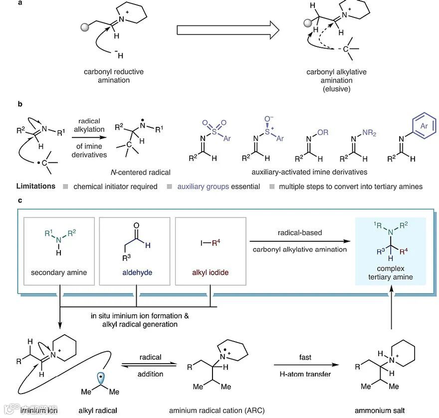 为了解决以上困难,合成化学家设想引入电中性的烷基自由基。但目前只有一例报道:1991年,B. H. Kim等人将烷基汞盐在紫外光照射下生成相应的烷基自由基,随后对甲醛衍生的亚胺离子进行加成(J. Am. Chem. Soc., 1991, 113, 373)。显然,如果对烷基-亚胺离子加成则会产生铵自由基阳离子(aminium radical cation,ARC),后者通过氢原子转移(hydrogen atom transfer,HAT)便得到质子化的叔烷基胺(下图c)。不过这个策略并不容易,因为反应中产生的几种活性中间体会相互竞争导致副反应,比如为了与烷基自由基反应,需要保证体系中有高浓度的烷基亚胺离子,但后者又可能被HAT试剂还原。近日,来自英国剑桥大学的Matthew J. Gaunt教授课题组利用可见光介导的自由基策略,将廉价易得的三种工业原料——醛、仲胺和烷基卤代物——转化为相应的复杂叔烷基胺。该反应操作简单、条件温和且无需金属催化,相关结果发表在Nature 上。