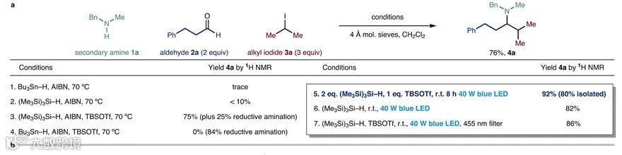 研究人员首先以N-甲基苄胺、氢化肉桂醛和2-碘丙烷为原料来筛选反应条件。在标准的自由基条件下(如Bu3Sn-H或(Me3Si)3Si-H+AIBN、70 ℃)仅能得到痕量的CAA产物4a。当在(Me3Si)3Si-H/AIBN体系中加入添加剂TBSOTf后,能显著地提高4a的收率,但也生成了1/3的还原胺化副产物。为了使操作更温和,研究人员引入了可见光并优化了反应条件,能够以较高的产率得到目标产物(entry 5-7),即使在无TBSOTf的条件下也能给出82%的收率(entry 6,适用于对酸敏感的底物)。尽管对这个现象的解释可能有几种,但C-I键的均裂是不太可能的,因为研究人员加装455 nm长通滤光片(过滤均裂所需的紫外和近紫外的光)仍然能以86%的收率得到4a(entry 7)。随后,研究人员系统地研究了CAA反应中各个底物、可能的中间体及复合物的吸光性质,发现没有一种成分或可能的中间体、复合物能够吸收大于455 nm的光,但烯胺(由1a和2a缩合而成)、2-碘丙烷(3a)和(Me3Si)3Si-H组成的三元混合物的UV-Vis吸收光谱显示出新的红移带(400-500 nm)。虽然目前还没有确凿的证据表明存在特殊的相互作用,但基于发现的事实,研究人员推断存在多组分相互作用并经可见光激发来引发自由基。