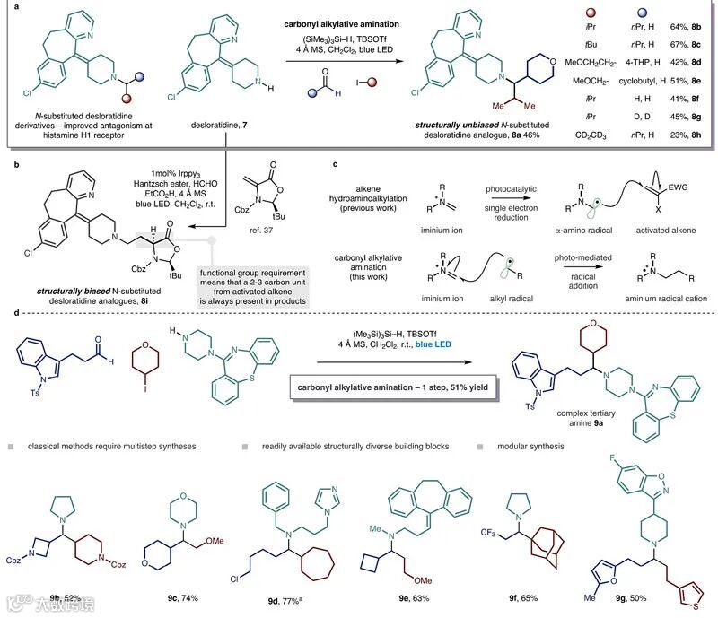 由于仲胺广泛存在于许多药物分子中,如治疗季节性过敏性鼻炎的desloratadine,而其叔胺衍生物最近也被证实能够显著提高药代属性并对组胺H1受体产生更长效的拮抗作用,因此研究人员通过CAA反应制备了一系列衍生物(8a-8h)。其实,研究人员先前就通过光氧化还原的方式将desloratadine与醛缩合而成的亚胺离子转化成α-胺基自由基,然后与活化的烯烃加成生成desloratadine的叔胺衍生物8i(Nature, 2018, 561, 522)。然而,相比之下,本文所提到的CAA反应是通过烷基自由基对亚胺离子进行加成的,具有更宽的底物范围,不需要预活化底物,便可将伯、仲甚至叔烷基卤代物与醛和仲胺“一锅法”转化为复杂的叔烷基胺(如9a-9g),而这三种底物都是简单易得的工业原料。