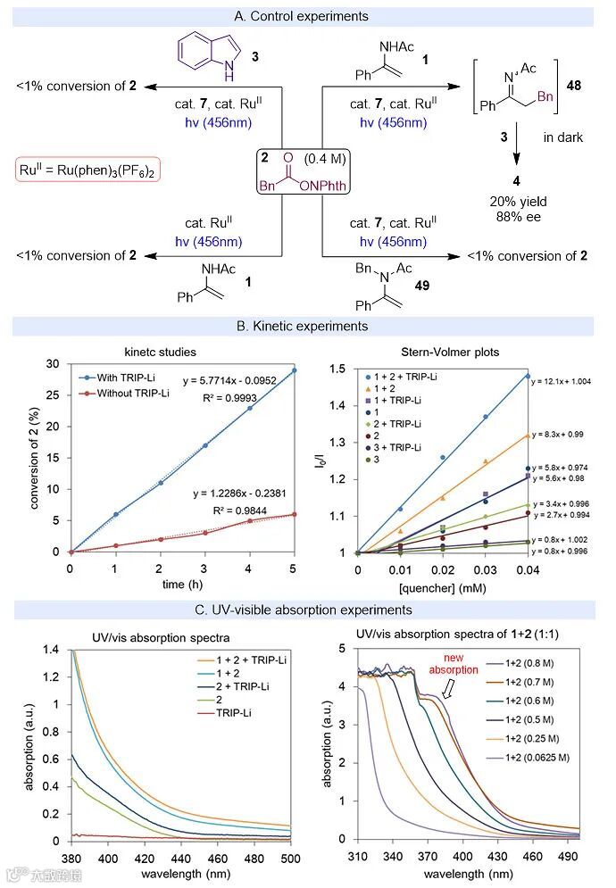 接下来作者对反应的机理进行了探究。首先作者设计了一系列的对照实验,实验结果表明该多组分反应是分步进行的,首先RAE和N-乙酰基烯胺发生光介导的自由基偶联并生成N-酰基亚胺中间体,随后该亚胺中间体与吲哚在手性磷酸锂的作用下发生不对称Friedel-Crafts反应。动力学实验和荧光淬灭实验表明手性磷酸锂可以显著地加快RAE和N-乙酰基烯胺的反应速率和荧光淬灭速率。作者还通过紫外可见吸收光谱研究发现RAE和N-乙酰基烯胺在高浓度条件下出现了370-400 nm新的吸收带,这表明二者有可能在高浓度条件下生成了电荷转移配合物(CTC)。最后通过比较光敏剂,RAE和N-乙酰基烯胺的氧化还原电位和三重态能量,作者认为光敏剂通过能量转移过程活化CTC或者N-乙酰基烯胺是比较可能的反应途径,而手性磷酸锂可以通过配位和氢键作用使RAE和N-乙酰基烯胺更加接近并生成CTC,从而加快RAE和N-乙酰基烯胺的反应速率。