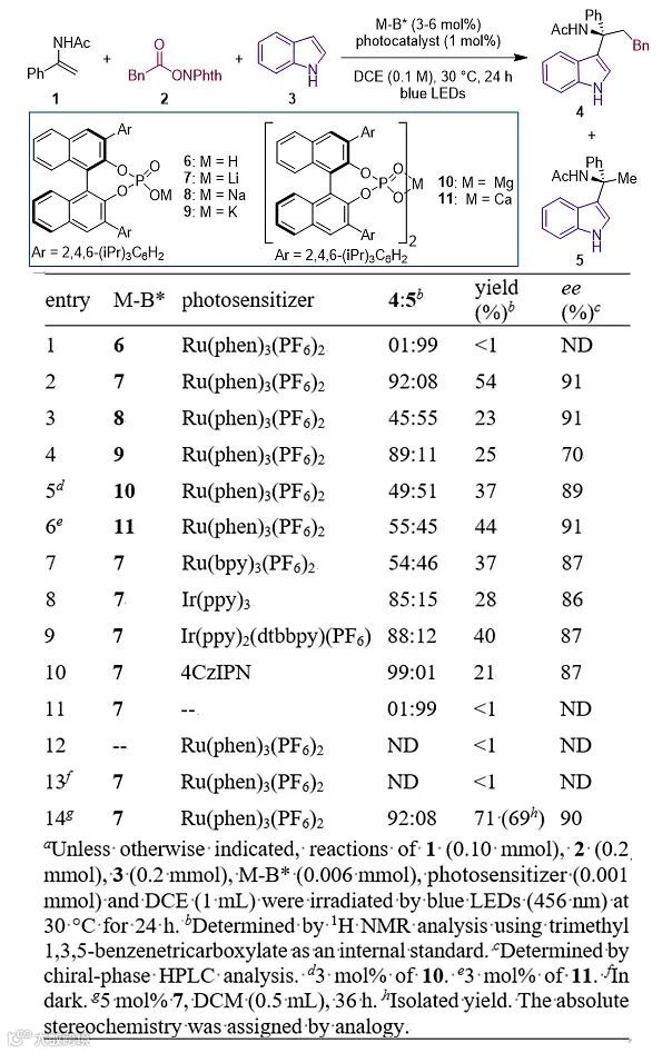 作者首先选择N-乙酰基烯胺1,苯乙酸衍生的RAE 2和吲哚3作为模板反应物,Ru(phen)3(PF6)2作为光敏剂。作者发现以手性磷酸6作为催化剂时,该反应几乎拿不到目标产物,只能得到N-乙酰基烯胺和吲哚的二组分加成副产物5。然后作者尝试了一系列酸性更弱的磷酸盐,发现磷酸盐可以显著地抑制副产物的形成。通过继续筛选不同的光催化剂和反应条件,作者确定了最优条件,能够以69%的分离收率和90%的对映选择性得到目标产物4。在最优条件下,作者对底物的适用范围进行了探索,发现该反应对于不同类型的N-乙酰基烯胺,RAE和吲哚都具有很好的适用性。