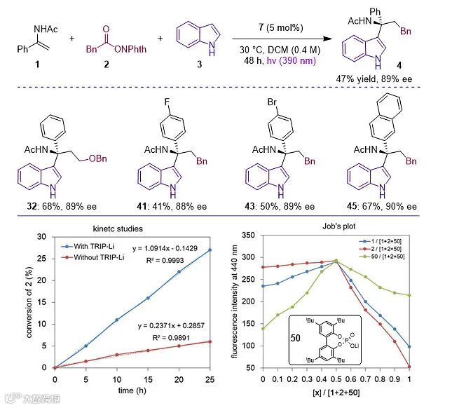 基于以上对机理的探究,作者又进行了直接光照实验并发现在不加入光敏剂的条件下,通过使用390nm光源和提高浓度也能使该三组分反应顺利进行,并以47%收率和89% ee的结果得到相应产物。直接光照条件也适用于其他类型的反应底物,并得到中等的收率和很好的对映选择性。动力学研究表明直接光照条件下手性磷酸锂也可以显著提高RAE的转化率,与光敏剂反应条件下的动力学结果一致。此外Job’s plot也显示烯胺、RAE和磷酸锂可以通过1:1:1的化学计量比发生相互作用。