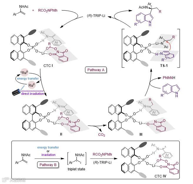 至此,作者提出了两种可能的反应途径。在途径A中,手性磷酸锂通过配位和氢键作用使RAE和N-乙酰基烯胺更加接近并生成CTC I,CTC I通过直接照射或光敏剂介导的能量转移进入激发态然后通过单电子转移生成中间体II。在途径B中,N-乙酰基烯胺首先通过直接辐射或能量转移被激发至三重态,然后三重态烯胺与手性磷酸锂和RAE结合得到CTC IV,CTC IV也可以通过单电子转移生成中间体II。然后II通过N-O键均解、脱羧和自由基偶联得到中间体III。中间体III通过质子转移离去邻苯二甲酰亚胺和得到手性亚胺中间体,最后手性亚胺与吲哚通过过渡态TS-1反应生成产物并再生手性磷酸锂。尽管反应途径A的可能性比较大,但途径B的可能性也并不能完全排除。