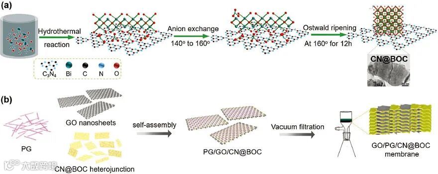 图1. (a)异质结CN@BOC的制备过程,(b)二维异质结膜(GO/PG/CN@BOC)的制备过程