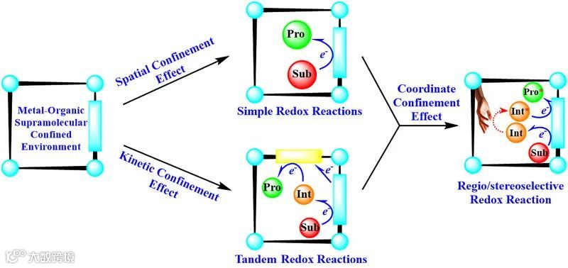 近年来,对于金属-有机配位超分子体系(主要包括金属-有机笼MOCs和金属-有机框架MOFs等体系)的开发和应用研究取得了巨大成功。其独特的配位自组装模式,赋予了该体系在金属节点、桥联配体及空腔客体等模块上的方便多元可调性,继而在识别、催化、气体分离及酶模拟等领域表现出重要的应用价值。对于该体系催化方面的研究,受限于催化体系的复杂性,过去相关综述往往聚焦在活性模块的引入方式以及催化反应的类型,却很少关注其内在的电子转移过程,未能体现出限域空间电子转移过程的优势。