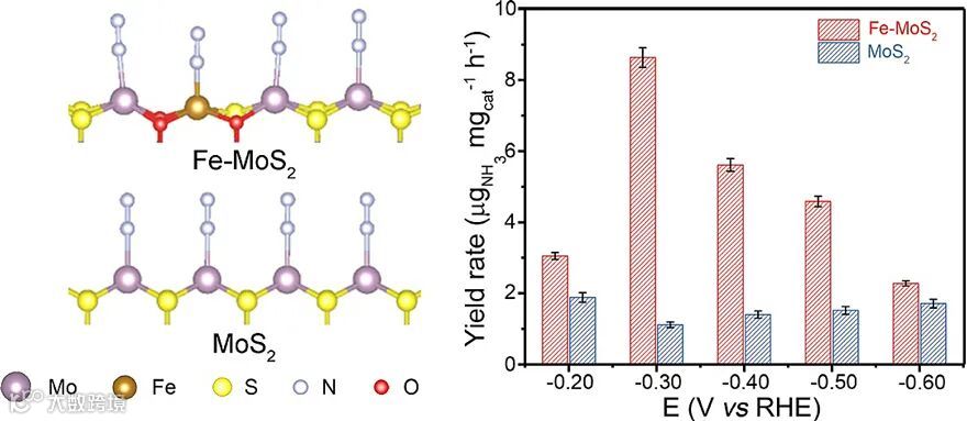 图1. Fe-MoS2催化剂和MoS2催化剂上N2吸附构型对比(左)及两种催化剂在不同反应电位下的产氨速率对比(右)。