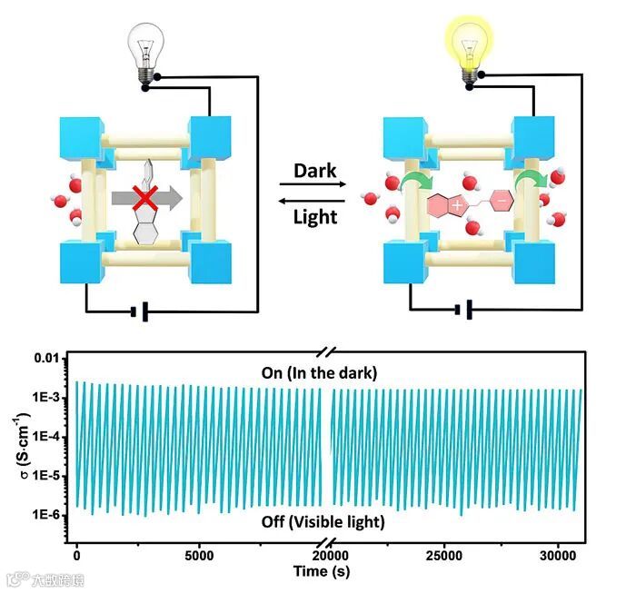 为此, 美国德克萨斯大学圣安东尼奥分校陈邦林教授和浙江大学彭新生教授课题组合作,利用一步封装法将光活性分子开关(磺酸螺吡喃)原位包埋于ZIF-8薄膜中,实现了兼具高质子传导率和大开关比的光响应质子传导杂化膜的制备。在避光环境下,磺酸螺吡喃分子处于merocyanine (MC) 构型,呈现亲水性和荷电性。此时,磺酸螺吡喃分子可与ZIF-8孔道中的水分子形成氢键网络,实现质子在孔道中的快速传输。在可见光照条件下,磺酸螺吡喃分子可快速(5 s)转变为相对疏水的spiropyran (SP) 构型,从而切断质子传输路线,降低质子传导率。在75 ℃,95%相对湿度条件下, 避光状态下的质子传导率达到了0.05 S cm-1,而光照条件下质子传导率只有1.8 × 10-6 S cm-1,开关比高达2.8 × 10-4。将杂化膜组装到光控电路中,可用于远程控制发光二极管的亮灭,证实了此类MOF杂化膜在光控电子器件领域具有重要的应用前景。