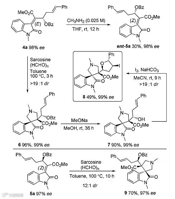 接着,作者对获得的手性四取代烯烃进行衍生化研究,如Scheme 4所示。在较低浓度的甲胺存在下,E-式化合物4a可转化为Z-式产物,此外无论是E-式还是Z-式的四取代烯烃都可以发生1,3-偶极环加成反应,得到螺环吲哚化合物。该螺环产物还可发生进一步转化,得到结构更为复杂的多手性中心化合物,实现了衍生产物的立体多样性合成。