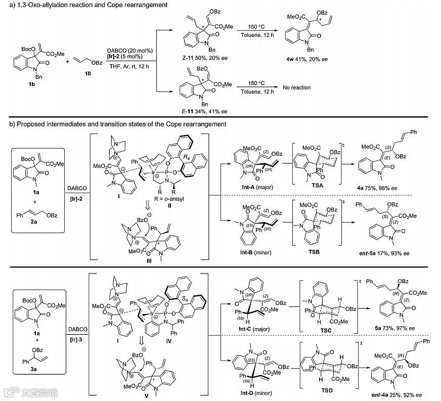 在机理研究中,作者发现当使用MBH碳酸酯1b和简单的烯丙醇苯甲酸酯10作为底物时,得到了1,3-氧烯丙基化产物,并且该产物存在Z-式和E-式两种异构体,而将这两种异构体进行加热时,只有Z-式异构体发生了Cope重排得到了四取代烯烃4w,并且ee值得以保持,而E-式异构体即使升温至180 ℃,也不能发生重排反应。基于该实验结果和以前有关手性铱配合物催化烯丙基化反应的文献报道,作者对该反应的机制进行了推测,如Scheme 5b所示。在1a和2a的反应中,首先, DABCO和手性铱配合物分别活化MBH碳酸酯1a和烯丙醇酯2a形成中间体Ⅰ和Ⅱ,接着通过协同催化过程发生γ-区域选择性的烯丙基烷基化反应形成中间体Ⅲ,该中间体进一步被苯甲酸根负离子进攻,进而消除DABCO生成了1,3-氧烯丙基化产物。在这步反应中产生的非对映选择性导致接下来协同Cope重排过程控制Z-式和E-式两种异构体的生成。