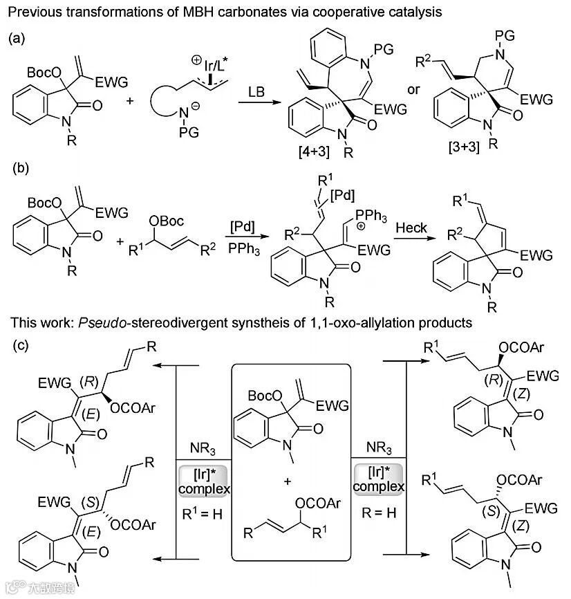 MBH产物及其衍生物分子中含有多种官能团,反应途径多样,被广泛应用于各种不对称转化。在前期工作中,作者课题组通过叔胺/手性铱配合物协同催化实现了靛红衍生的MBH碳酸酯的不对称[4+3]及[3+3]环化反应(Scheme 2a),以及通过膦/钯协同催化实现了MBH碳酸酯和烯丙醇碳酸酯的自动串联协同催化反应(Scheme 2b)。而在本项研究中,作者发现叔胺/手性铱配合物能协同催化MBH碳酸酯和烯丙醇酯发生形式1,1-氧烯丙基反应,并通过调控手性铱催化剂和微调底物结构,实现了手性四取代烯烃的立体多样性性合成(Scheme 2c)。