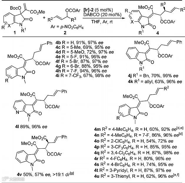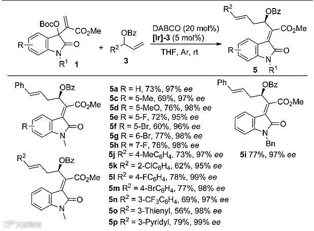 随后,作者对合成E-构型的四取代烯烃的反应的底物适用性与局限性进行了考察:各种取代的靛红衍生的MBH碳酸酯1均展现出良好的反应活性 (Table 2, 4b-4l);而富电子、贫电子的芳(杂)环取代的烯丙醇酯2也取得不错的结果 (Table 2, 4m-4u)。此外,当在烯丙醇酯2的α位引入一个吸电子基团时,能以中等的收率和ee值以及优异的非对映选择性获得产物4v (Table 2)。作者也对合成Z-构型的四取代烯烃的反应的底物适用性进行了考察:各种取代的靛红衍生的MBH碳酸酯1和烯丙醇酯2均展现出良好的反应活性 (Table 3, 5a-5p)。
