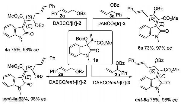 在条件优化中,作者选择MBH碳酸酯1a和苯甲酰烯丙醇酯2a作为底物,在手性铱配合物[Ir]-1和DABCO的协同催化下,能以中等的收率和优异的立体选择性获得E-构型的手性四取代烯烃4a和少量Z-构型烯烃产物ent-5a。接着作者通过对催化剂和烯丙醇酯类底物2的筛选,最终能以优秀的收率和对映选择性获得E-构型的手性四取代烯烃产物4b (91% yield, 97% ee)。另外,当以1a和3a作为底物时,在手性铱配合物[Ir]-3和DABCO的协同催化下,能以中等的收率和优异的对映选择性获得Z-构型的手性四取代烯烃产物5a (73% yield, 97% ee) (Table 1)。