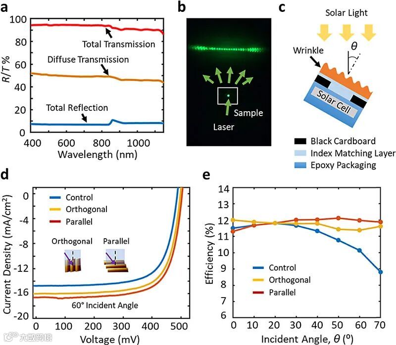 在光学性能方面,具有表面褶皱形貌的PDMS其褶皱结构散射造成的漫透射约占整体入射光的50%,表明具有表面褶皱的PDMS膜可作为有效的光学漫射器。将褶皱状PDMS膜作为单晶硅太阳能电池顶层封装膜,在光入射角为60° 时,褶皱状PDMS封装的太阳能电池展现出更高的电流密度。同时,相对于具有光滑封装表面的太阳能电池,具有褶皱状PDMS封装的太阳能电池随热射光角度变化其光电转化效率更为稳定。