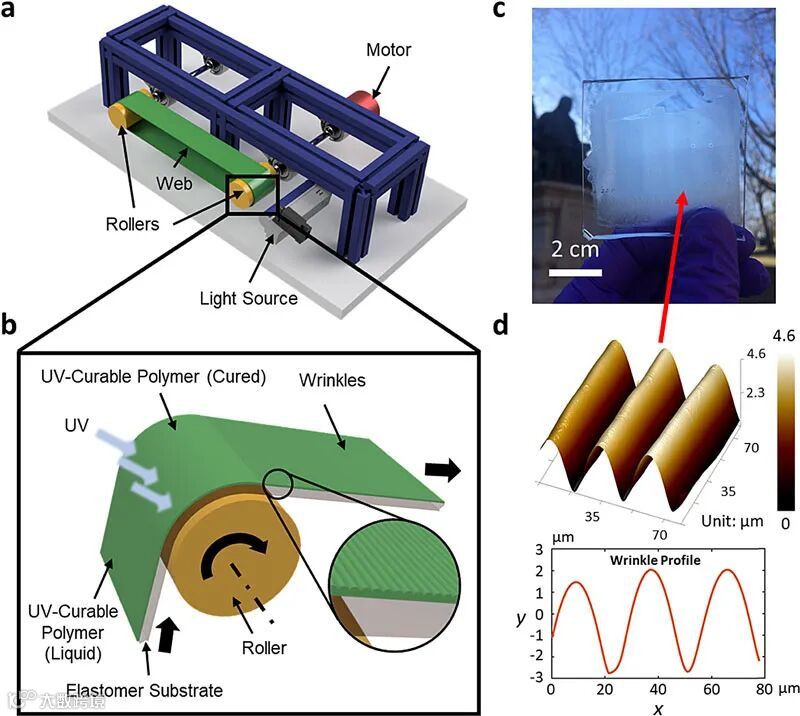 在材料表面微纳形貌构筑领域,表面起皱技术在操作步骤、制备成本等方面具有明显的优势。该研究基于“卷对卷”加工技术,进一步实现了UV-PDMS表面皱纹形貌的连续、大规模制备,无疑将更进一步推动表面起皱技术在光学、电子学等领域的商业化应用。同时,该研究成果可进一步拓展至其他聚合物基材料表面微纳结构功能化的构筑应用。