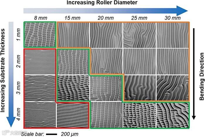 研究团队以PDMS为弹性基底,表面涂覆UV光固型UV-PDMS 预聚体,圆辊转动的过程中UV光引发UV-PDMS聚合固化形成软/硬复合体系;随着圆柱连续旋转复合体系弯曲应力释放后表面形成相应的皱纹形貌。进一步研究表明,PDMS表面形成的皱纹形貌依赖于材料膜厚以及辊曲率(圆柱直径);因此基于PDMS基底膜厚以及圆柱直径的调控,可实现材料表面棋盘状褶皱及平行或垂直取向一维皱纹形貌的可控制备。