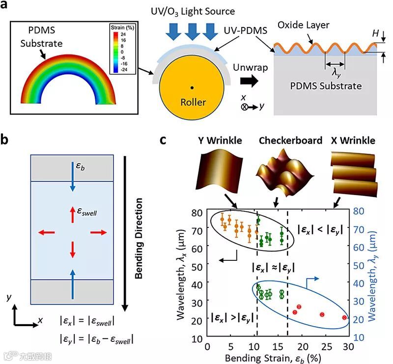UV-PDMS表面褶皱形貌形成机理分析。图片来源:ACS Appl. Mater. Interfaces