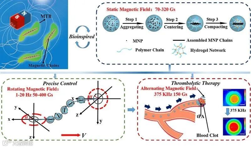 仿趋磁菌软体微型机器人的设计、制备、磁控及其微血管溶栓应用示意图。