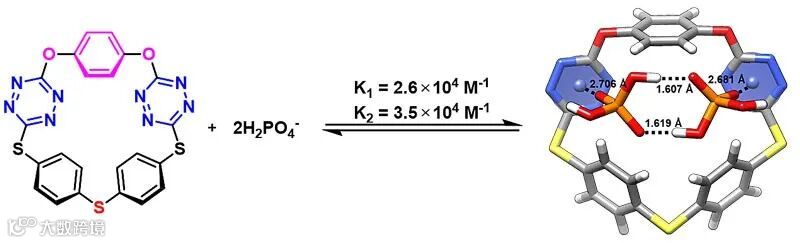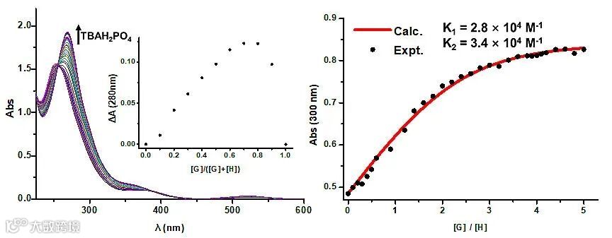 作为含有奇数芳香环单元的缺电子大环物种,含有两个四嗪单元的冠[5]芳烃是一类很好的富电子物种受体,呈现出独特的阴离子识别性能,它们可以选择性地识别磷酸二氢根离子。紫外-可见光谱滴定的结果表明,冠[5]芳烃可以与磷酸二氢根形成主客体比例1:2的复合物,第一级作用常数K1最大为3.9×104 M-1,第二级作用常数K2最大为1.0×105 M-1(图2),第二级作用常数明显大于第一级作用常数,呈现了冠[5]芳烃与两个磷酸二氢根离子识别中的协同效应。