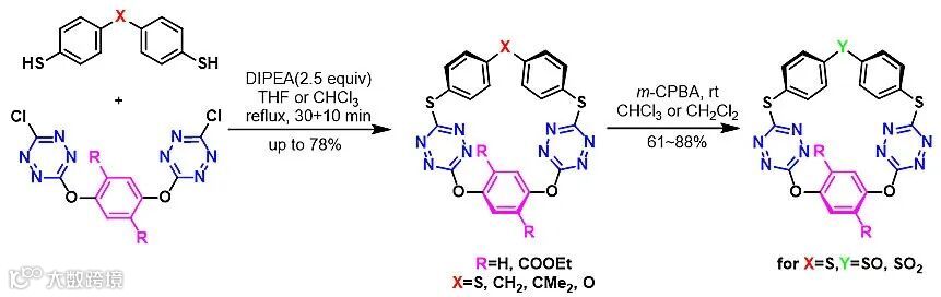 该团队首先发展了(3+2)片段偶联方法,利用便宜易得的原料,以芳香亲核取代反应和成环后氧化修饰反应为核心,高产率地合成了一系列新型冠[5]芳烃化合物。在片段偶联法构建大环方面,通过改变不同的醚连三芳基片段与二巯基二苯醚反应物上的取代基结构和杂原子种类,便可获得了分子结构多样性丰富新颖冠[5]芳烃大环化合物。进而以所获得的含有三个硫醚连接单元的冠[5]芳烃为原料,利用硫原子化学环境的差异和氧化条件的控制,实现了含有亚砜和砜基桥连单元的冠[5]芳烃分子的选择合成(图1)。X-射线单晶衍射与电化学研究结果表明,冠[5]芳烃分子形成了五边形花冠构象结构和空腔,桥连原子与芳环取代基种类对于冠[5]芳烃的结构和电化学性质都有显著的调节作用。
