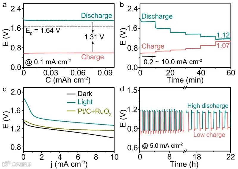 A:该项研究实现了光能在锌-空气电池放电与充电两个过程中的同时高效利用,展现出了优异的电化学性能。即使是在10 mA cm-2的电流密度下,其放电电压也能高于充电电压,是一种“反常规”的现象。但目前这一成果尚处于概念型阶段,有待进一步的研究与开发。不过,我们相信这项研究成果将对光电化学在电池、催化相关领域中的直接应用与发展产生积极的推动作用。