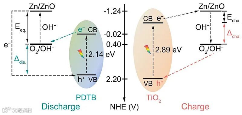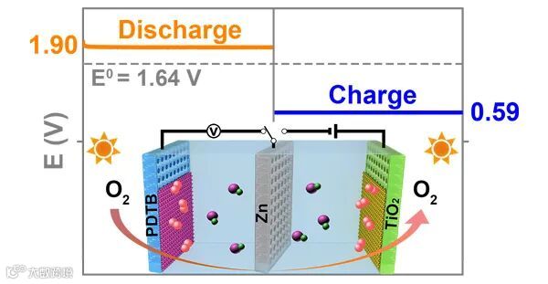 近几年,直接将光能在可充电电池中进行转换或存储的尝试引起了研究人员的极大兴趣,但如何在锌-空气电池中同时实现光能向电能和化学能的转化仍存在机制认识不清和电极材料缺失的难题。对此,南开大学李福军团队采用原位负载于碳纤维上的聚(1,4-二(2-噻吩基)苯(PDTB)和二氧化钛(TiO2)半导体作为锌-空气电池的正极催化剂,分别用于光激发ORR与OER,并分别在放电与充电过程中与多孔锌负极构成回路。在放电过程中,PDTB电极受光照,被激发的光电子进入PDTB的导带,注入O2的分子轨道,从而促进ORR,提升电池的放电电压;在充电过程中,TiO2电极受光照,价带中形成强氧化性的空穴,在外加电压的作用下驱动OER,同时光电子通过外电路传输到负极将ZnO还原为Zn,进而降低电池的充电电压。这种三明治锌-空气电池结构确保了同时在放电和充电过程中的光能利用。