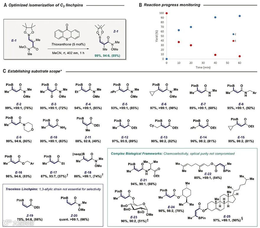 在确定基本思路后,作者开始对反应的标准条件进行摸索。发现以噻吨酮(5 mol%)为光敏剂、乙腈为溶剂,在402 nm波长的可见光照射下,反式的2-甲基-3-硼酸酯-丙烯基酰胺(E-1,图2A)在室温下反应1 h,便能以99%的NMR收率、94:6的Z:E比转化为顺式2-甲基-3-硼酸酯-丙烯基酰胺(Z-1)。对于标准反应,作者也进行了追踪实验研究。可以发现,反应10 min后,转化率已经超过60%;60 min后,转化率高达95%。随后,作者对该异构化反应的底物范围进行了研究(图2C)。对于β-位甲基取代的底物(E-2和E-3),反应的选择性非常优秀(> 99:1)。除甲基外,该反应也能兼容其他大位阻的取代基,收率和选择性都非常好(E-4、E-5、E-6)。对于普通的丙烯酸仲酰胺(E-7和E-8)、丙烯酸叔酰胺(E-9)以及丙烯酸伯酰胺(E-10),都能以非常好的选择性实现异构化(up to >99:1)。虽然丙烯酸酯也能兼容该反应,但是当α-位有烷基取代基时,在硅胶色谱柱上不稳定(Z-11),从而降低分离收率。对于β-位取代的各种丙烯酸酯,均能以高收率(81%-89%)、高选择性(up to 98:2)得到相应的异构体(E-12-E-16)。除丙烯酸酰胺和酯外,共轭烯酮也能参与该反应(E-17, 93:7)。除频那醇硼酸酯外,其他硼酸酯(如新戊基硼酸酯)也能参与该反应且选择性高(> 99:1)。另外,当丙烯酸酯或丙烯酰胺的α-位为简单氢原子时,反应的收率和选择性并不受影响(Z-19和Z-20),这样就说明了反应的选择性并非由烯烃取代基的位阻排斥作用引起的。为了进一步研究该反应的实用性,作者尝试了更复杂的底物(如糖类衍生物、薄荷醇衍生物和甾体化合物),都能以良好的收率和选择性获得目标产物(E-21-E-25)。
