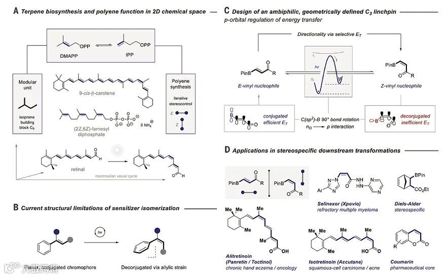多烯(polyenes)结构是一类广泛存在于生物化学过程中的结构单元。在这些生物化学过程中,烯烃的顺反构型具有非常重要的意义,顺式和反式烯烃代表了不同的信息,进而能调控不同的生化过程。其中最经典的例子就是视黄醛与视觉的关系——通过视黄醛这种烯烃分子顺反构型的改变,生物能够对外界光线做出反应,这也成为生物具有视力的生物学基础。尽管多烯分子在药物分子和材料领域中非常重要,但是要想高立体选择性地合成这些分子仍颇具挑战。美国伊利诺伊大学香槟分校的Burke课题组通过迭代Suzuki偶联反应,可以快速地合成单一固定构型的共轭多烯,但是要依靠已有烯烃的立体化学,并不能合成原料烯烃的异构体。在生物化学中,通过酶催化的立体发散性生物合成或者异构化过程,可以将不同的烯烃结构单元高选择性地连接起来,进而合成许多复杂的萜烯类化合物(图1A)。受此启发,合成化学家开发了非酶催化的类似反应,即通过一种构型烯烃的异构化来获得另一种构型的烯烃。从原子经济性和步骤经济性来讲,通过能量转移实现烯烃的异构化进而发散性合成烯烃异构体非常符合绿色化学原则,因为该过程不需要额外的当量化学试剂或合成步骤。
