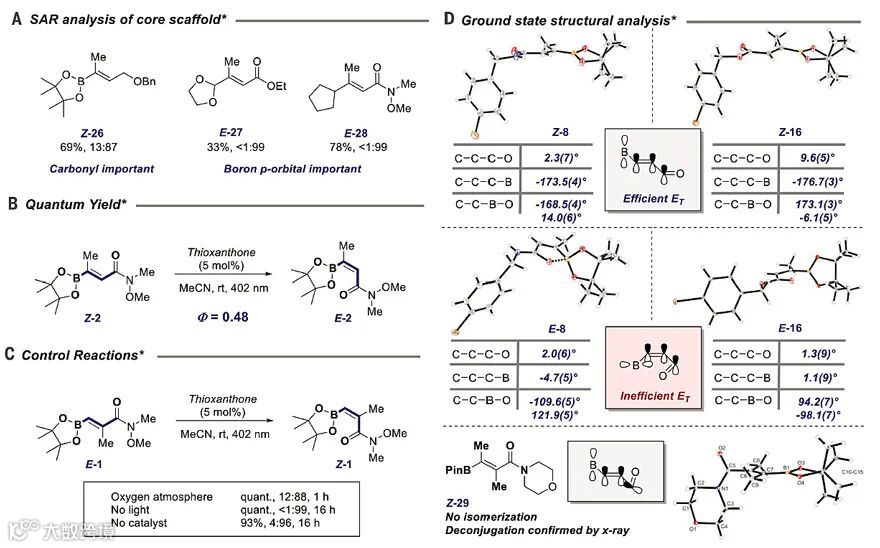 根据作者的设想,反应的选择性不是源于烯烃取代基的位阻效应,而是源于硼原子和羰基氧原子的路易斯酸碱作用。为了验证这一假设,作者进行了对照试验。当用烯丙醚作为反应底物时(Z-26),反应的异构化产率仅有13%,这证明了底物中羰基官能团的重要性。当用不含硼原子的丙烯酸酯或丙烯酰胺时,异构化反应完全被抑制,表明了硼原子对该异构化反应不可或缺(E-27和E-28,图3A)。为了验证该反应是否经过自由基链反应机理,作者测量了该反应的量子效率。结果表明量子效率为0.48,证明了该反应并不是一个自由基链反应(图3B)。进一步的对照试验表明,惰性气体氛围、光以及光催化剂对该异构化反应至关重要(图3C)。X射线晶体结构表明,当底物上的羰基和硼酸酯位于双键两侧时,硼酸酯和双键位于同一平面;对于异构化产物,硼原子则旋转了90 ℃,破坏了底物烯烃中硼原子p轨道与双键π轨道的共轭性,这些数据和作者的最初假设都完全吻合(图3D)。
