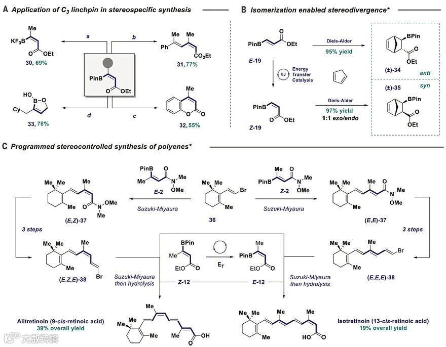 鉴于有机硼酸酯是合成化学中一类应用非常广泛的官能团,于是作者对产物进行了衍生化。比如,获得的硼酸酯可以转化为相应的三氟硼酸钾盐,也可以通过Suzuki偶联反应合成共轭烯烃,或者通过Suzuki偶联和酯交换串联反应来合成香豆素,还可以通过酯还原和酯交换串联反应来合成环状硼酸衍生物(图4A)。在Diels-Alder反应里,丙烯酸酯是一类活性非常高的亲双烯体,而亲双烯体的顺反构型将直接决定产物的立体化学。因此作者用该方法将E-19转化为Z-19,然后对其进行Diels-Alder反应,从而获得立体化学不同的加成产物(图4B)。前文曾提到,复杂的共轭多烯结构在许多领域都非常重要,所以作者也用该方法合成了立体构型互补的复杂共轭多烯。从简单易得的共轭二烯36出发,分别与E-2和Z-2进行 Suzuki偶联反应,以较高的收率和选择性得到(E,Z)-37和(E,E)-37,后者经过简单的官能团转换反应得到(E, Z, E)-38和(E, E, E)-38。然后,38的两个异构体分别和Z-12和E-12发生Suzuki偶联反应和水解反应得到不同的天然产物Alitretinoin和Isotretinoin(图4C)。图4这些例子充分说明了该反应在多步合成中的实际应用价值。
