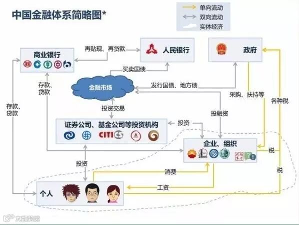 中国金融体系里有6个主要实体:人民银行、政府、商业银行、证券公司等金融投资机构、企业、个人。理解金融体系只不过需要了解这6个实体的功能,及相互之间的关系。