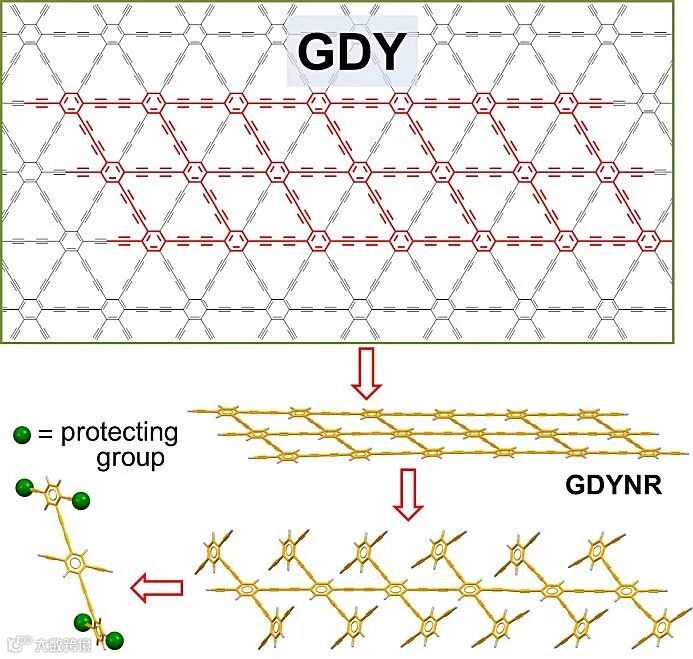 石墨炔(GDY)具有丰富的碳化学键,高π共轭性、宽面间距、均匀分散的孔道构型、天然带隙、优异的化学和热稳定性,被誉为是最稳定的一种人工合成的二炔碳的同素异形体。其在新能源、催化、光电转换等领域表现出巨大的应用潜力。理论预测随着维度的降低,石墨炔的性能会受到很大的调控。一维石墨炔纳米带的能带结构与边沿结构、带宽有关,石墨炔纳米带的带隙随纳米带宽度增加而减小,因此石墨炔纳米带在研究纳米尺度电子器件方面具有重要的意义。合成石墨炔纳米带有两种思路,一种是“自上而下”法,另一种是“自下而上”法。“自上而下”的思路例如从石墨炔上进行切割,会导致制备所得的石墨炔纳米带的宽度和边缘结构不确定。而“自下而上”的化学合成方法可制备出结构确定、宽度均一的石墨炔纳米带。但在合成过程中必须控制乙炔基的选择性逐步偶联,“自下而上”法合成石墨炔纳米带仍旧是一个挑战。